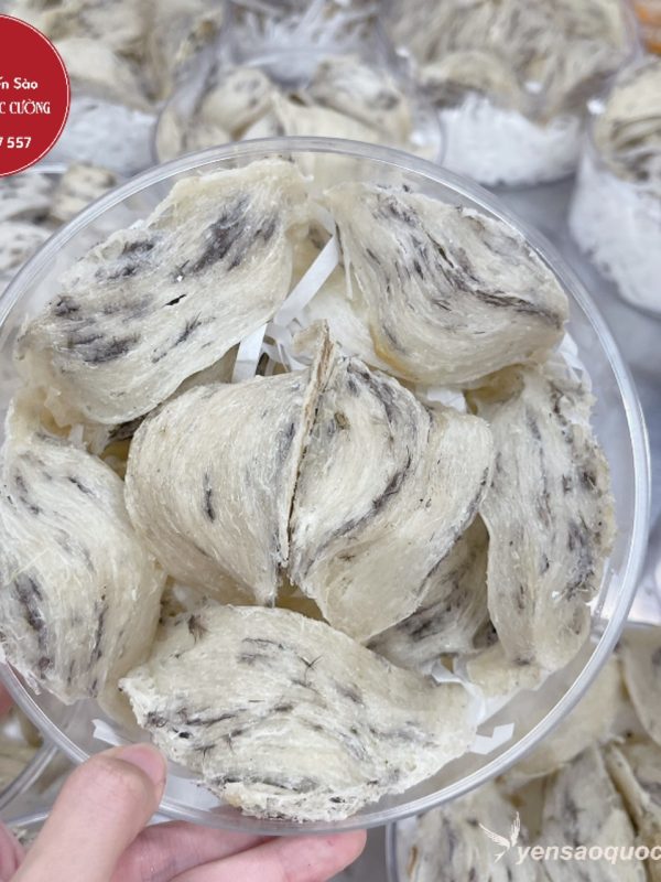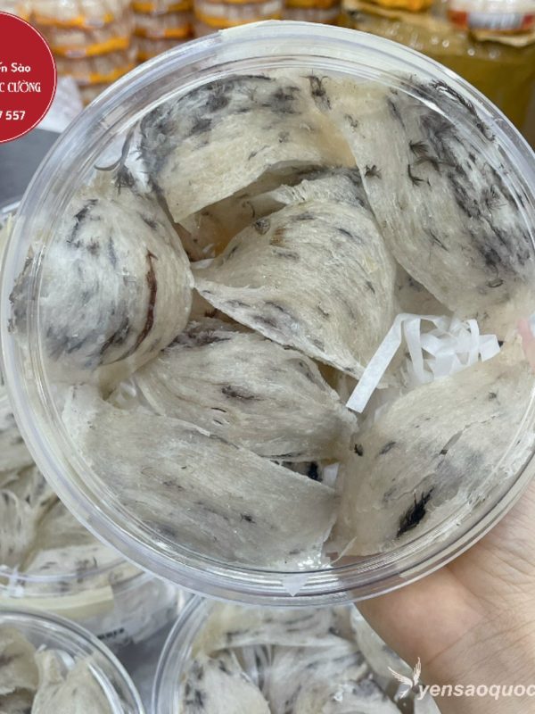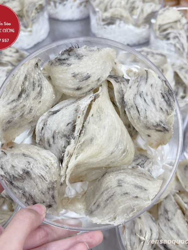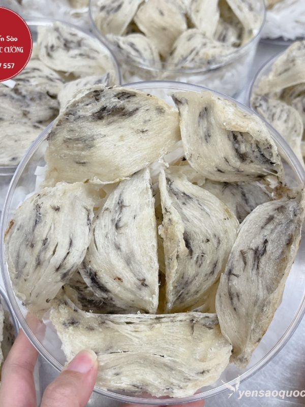 Tổ yến có hình võng tròn, dày đồng đều, có bụng, màu trắng ngà sẫm, còn lông.